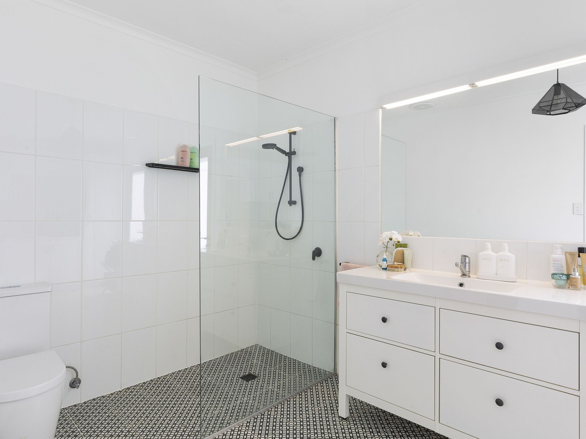 A spacious, combined bathroom & laundry with stunning Italian floor tiles, step-less shower, and plenty of storage space.