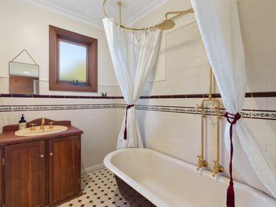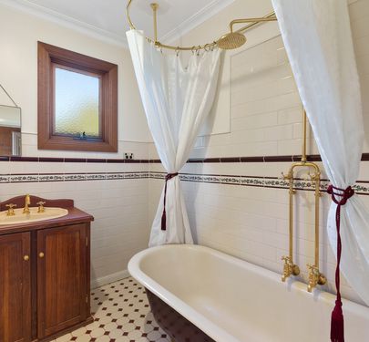 - Country style bathroom with brass fittings and claw foot bath.