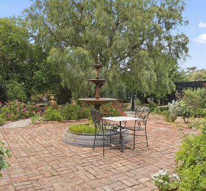 The outdoor spaces are equally enchanting. A beautifully bricked area provides a large sitting and entertaining space, complete with a charming water feature. Tall lamp posts are thoughtfully scattered throughout the grounds, adding character and ambiance. Boxed veggie gardens and mature, established trees enhance the propertys serene, picturesque setting.