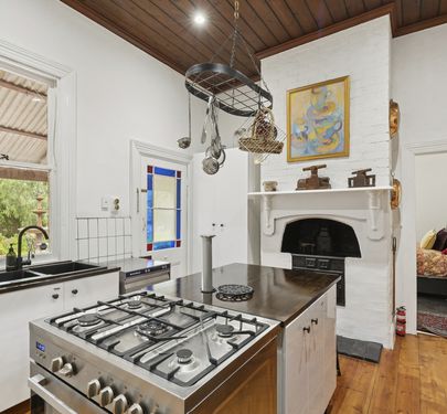 The kitchen is warm and inviting, complete with a central island bench and plenty of space for daily living. Throughout the home, beautifully preserved original features highlight the care and respect with which this property has been maintained.