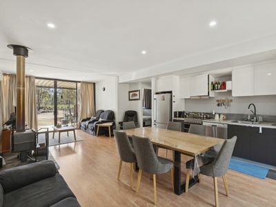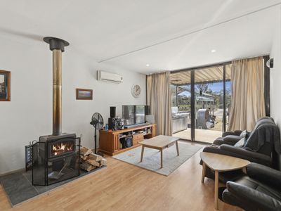 The main residence is thoughtfully designed to embrace its surroundings, with a sophisticated open-plan kitchen, living, and dining domain forming the heart of the home. Expansive windows invite the outdoors in, while a statement wood fire and split-system climate control ensure year-round comfort. Two beautifully appointed bedrooms and two bathrooms provide elegant accommodation, headlined by a sumptuous master retreat complete with a generous walk-in wardrobe and private ensuite. Every space has been curated to balance warmth, style, and effortless liveability.