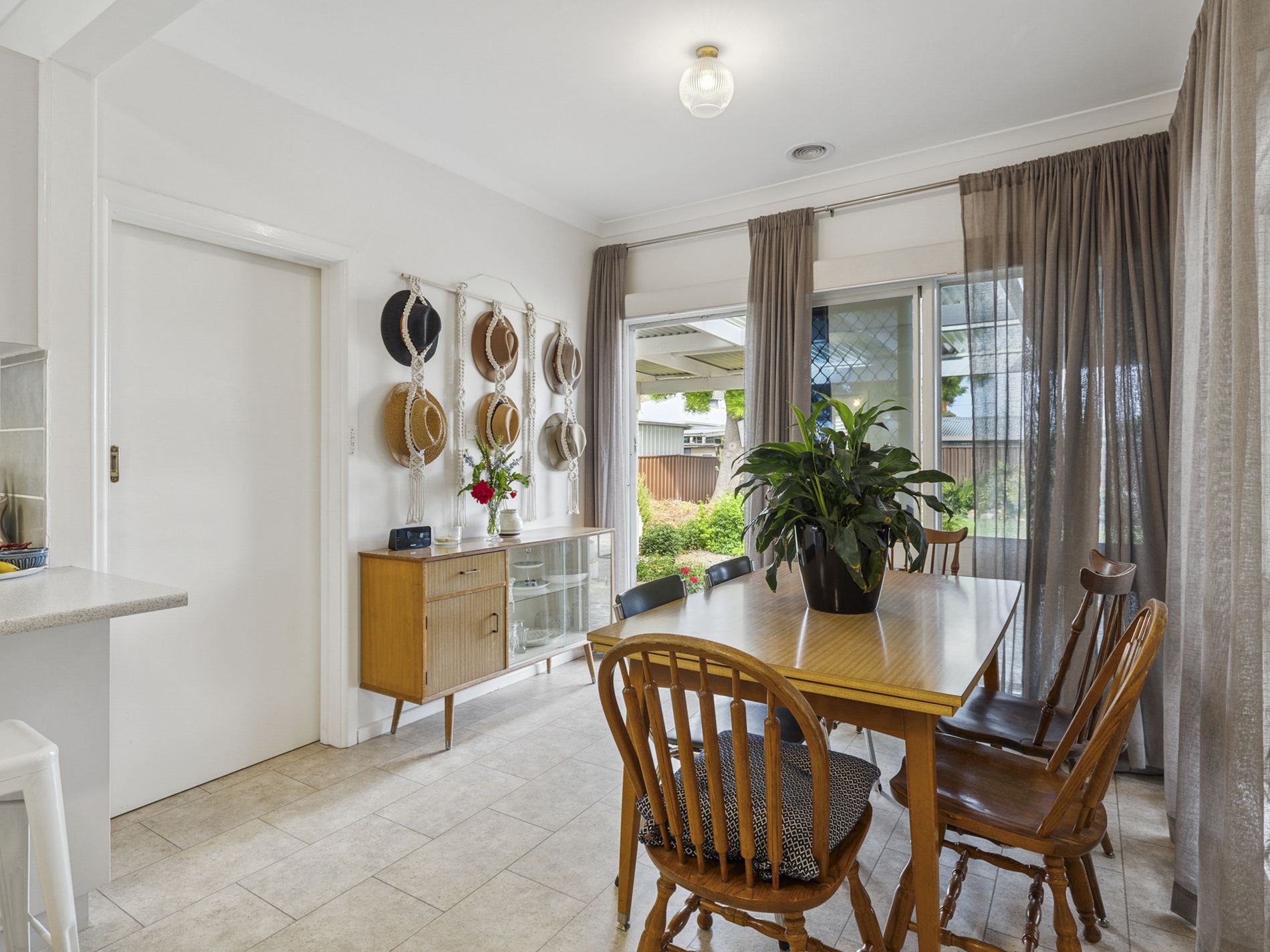The heart of the home is the gorgeous kitchen, offering plentiful cabinetry and a stylish dining area. Updated to blend seamlessly with the home's elegance, the space is adorned with sheer curtains that lead to a low-maintenance garden.