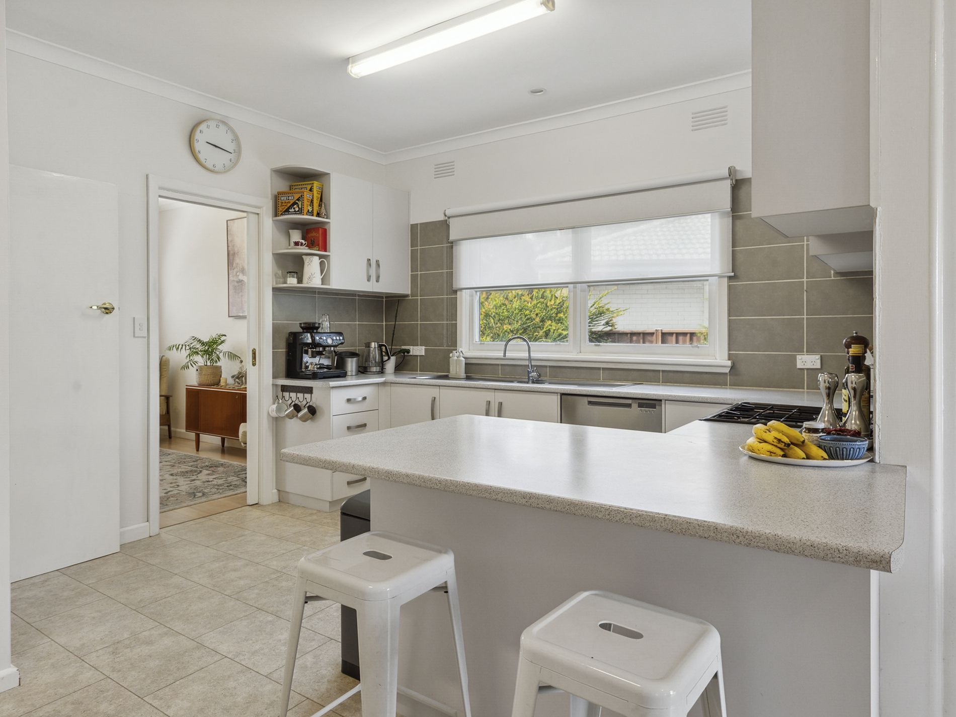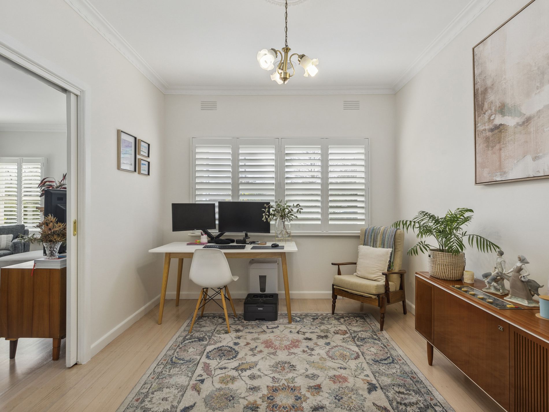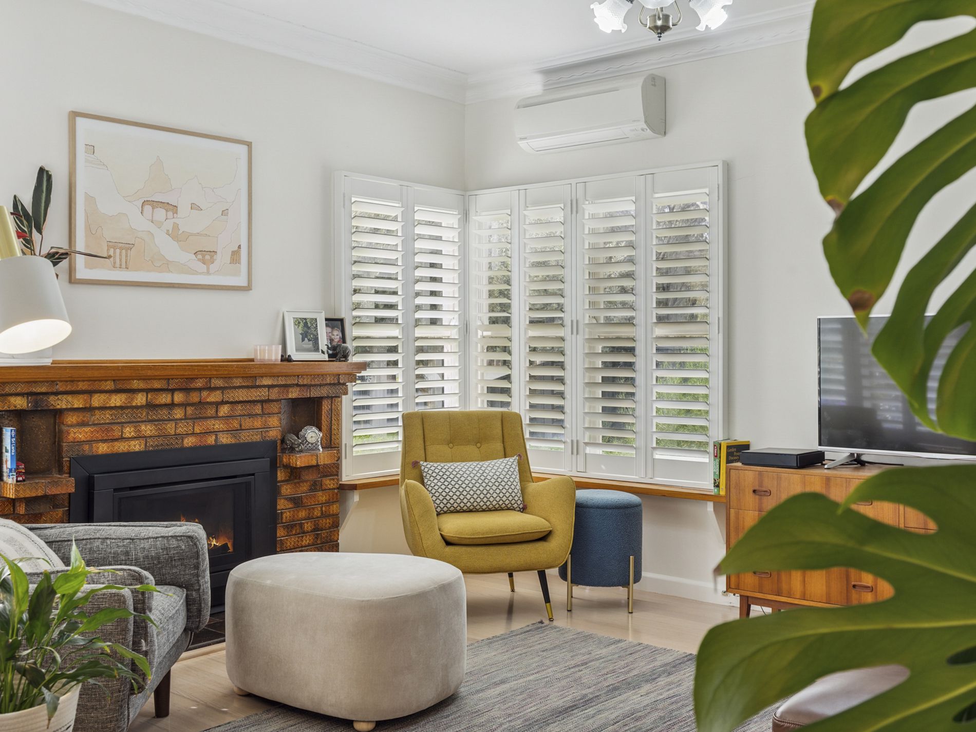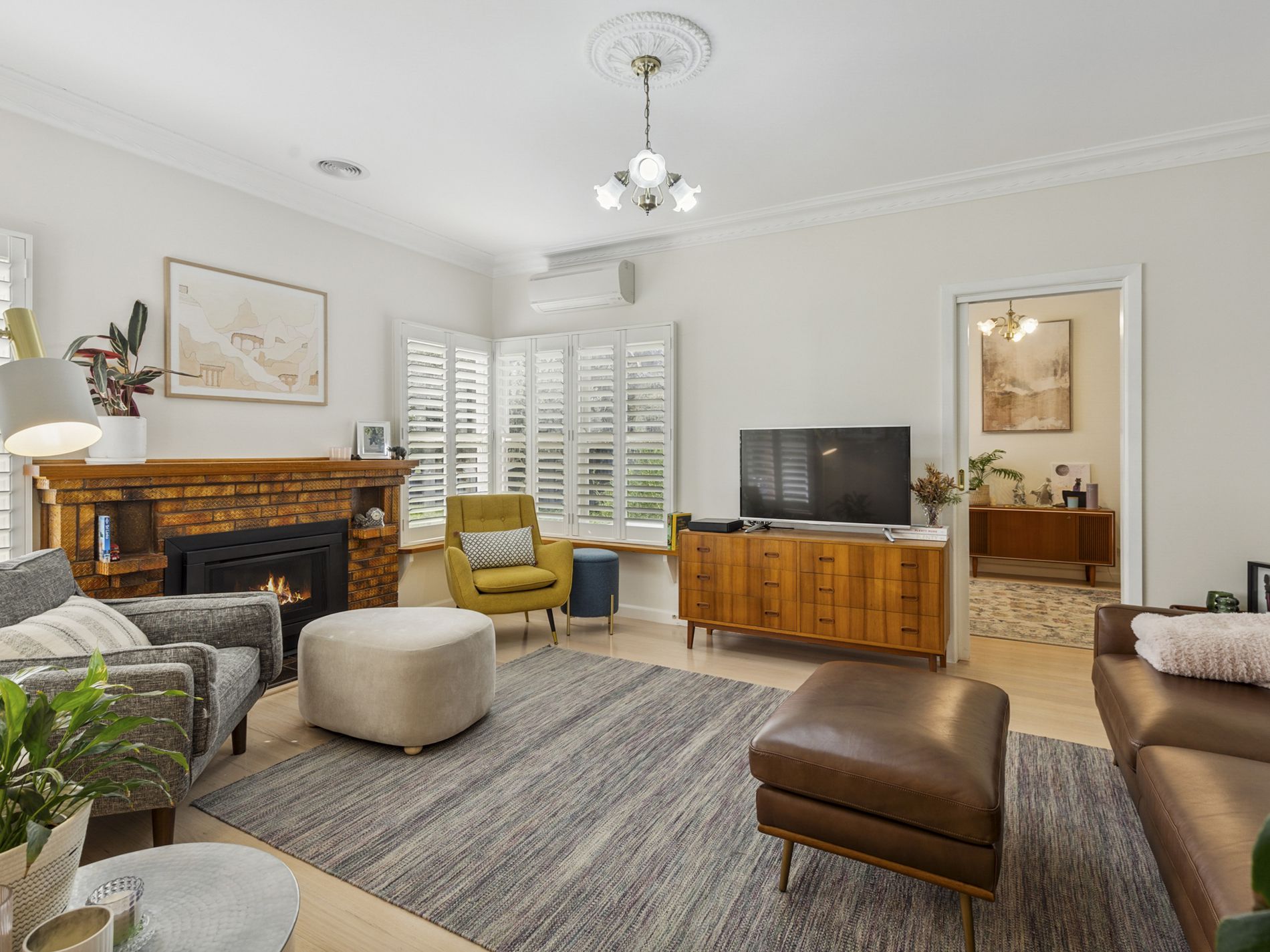 Step inside to discover whitewashed floorboards that create a warm, inviting atmosphere. The spacious lounge room, complete with a split system and gas heater, is designed for family gatherings and moments of love. Plantation shutters adorn the front rooms, enhancing the home's classic elegance alongside the preserved original light fixtures and cornices.