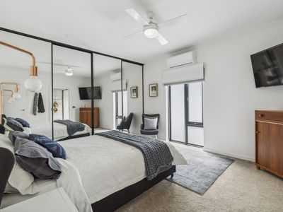 Additional highlights include split-system air conditioning in the bedrooms and main living area, a large laundry with a separate powder room, and the convenience of included appliances: a refrigerator and front-load washing and dryer set.