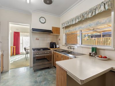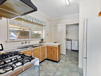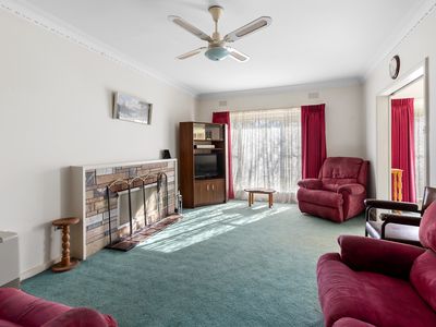 Charming Interiors: The kitchen retains its original cabinetry with great storage, flowing into a formal dining space and a cozy living area featuring a gas heater and open fireplace. A split system ensures comfort at the rear of the home, while a wall-mounted cooler/heater services the dining area.