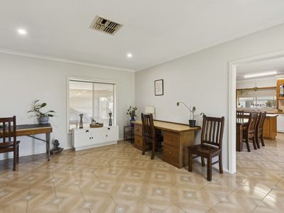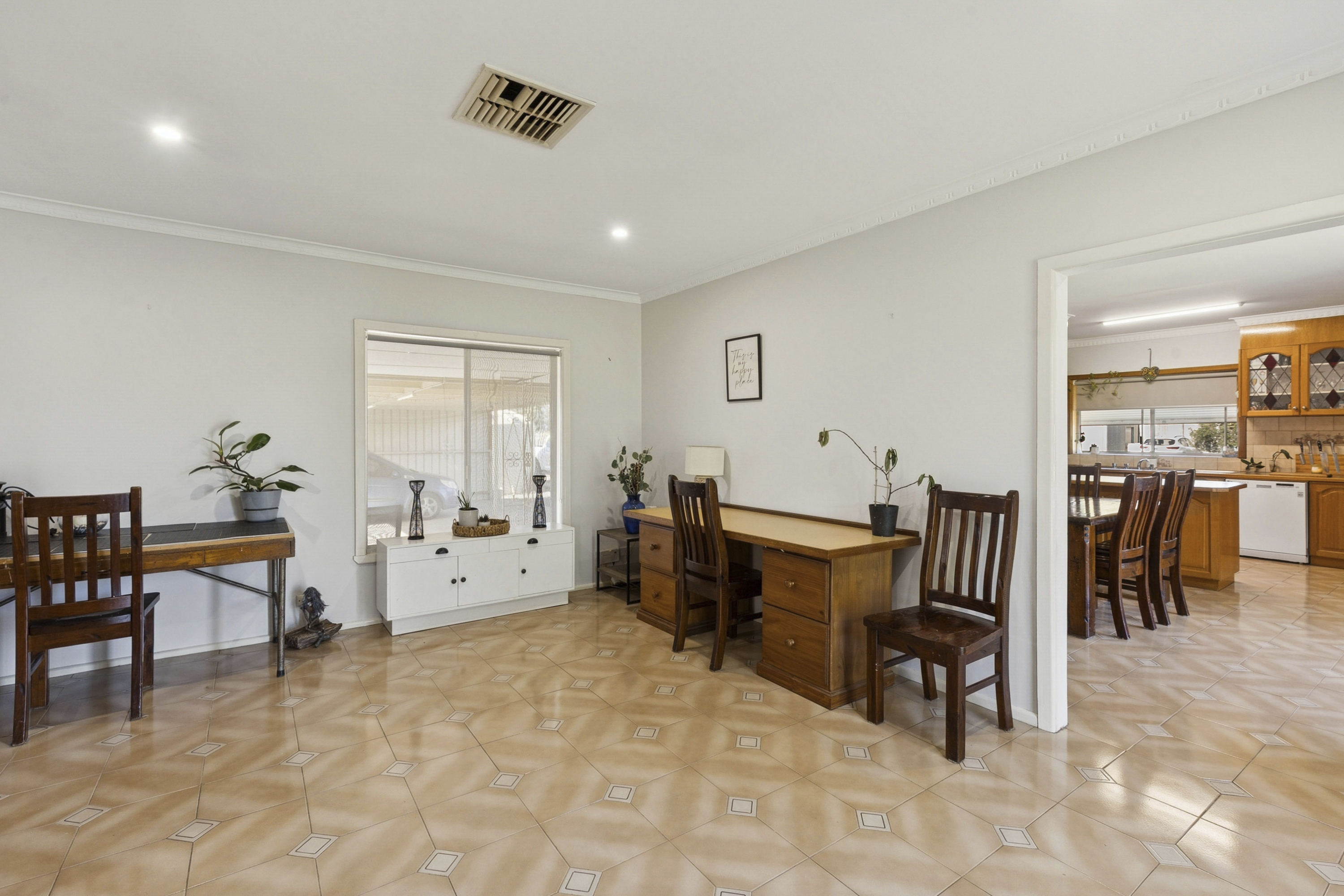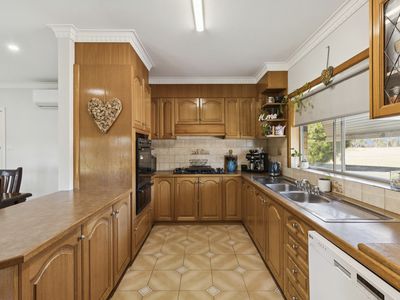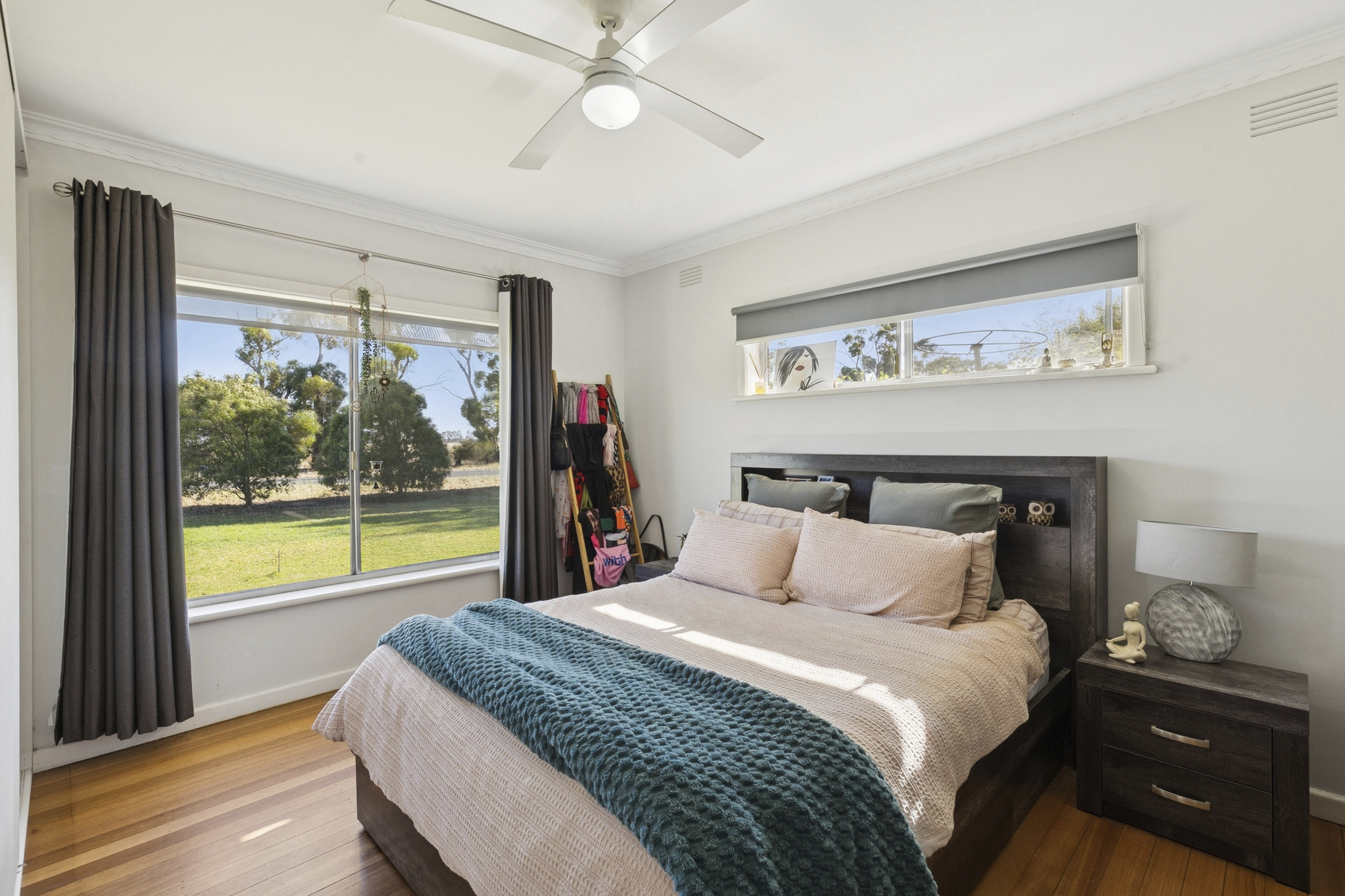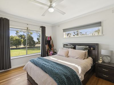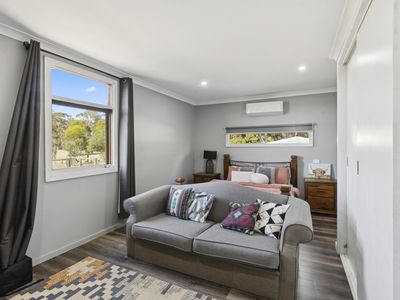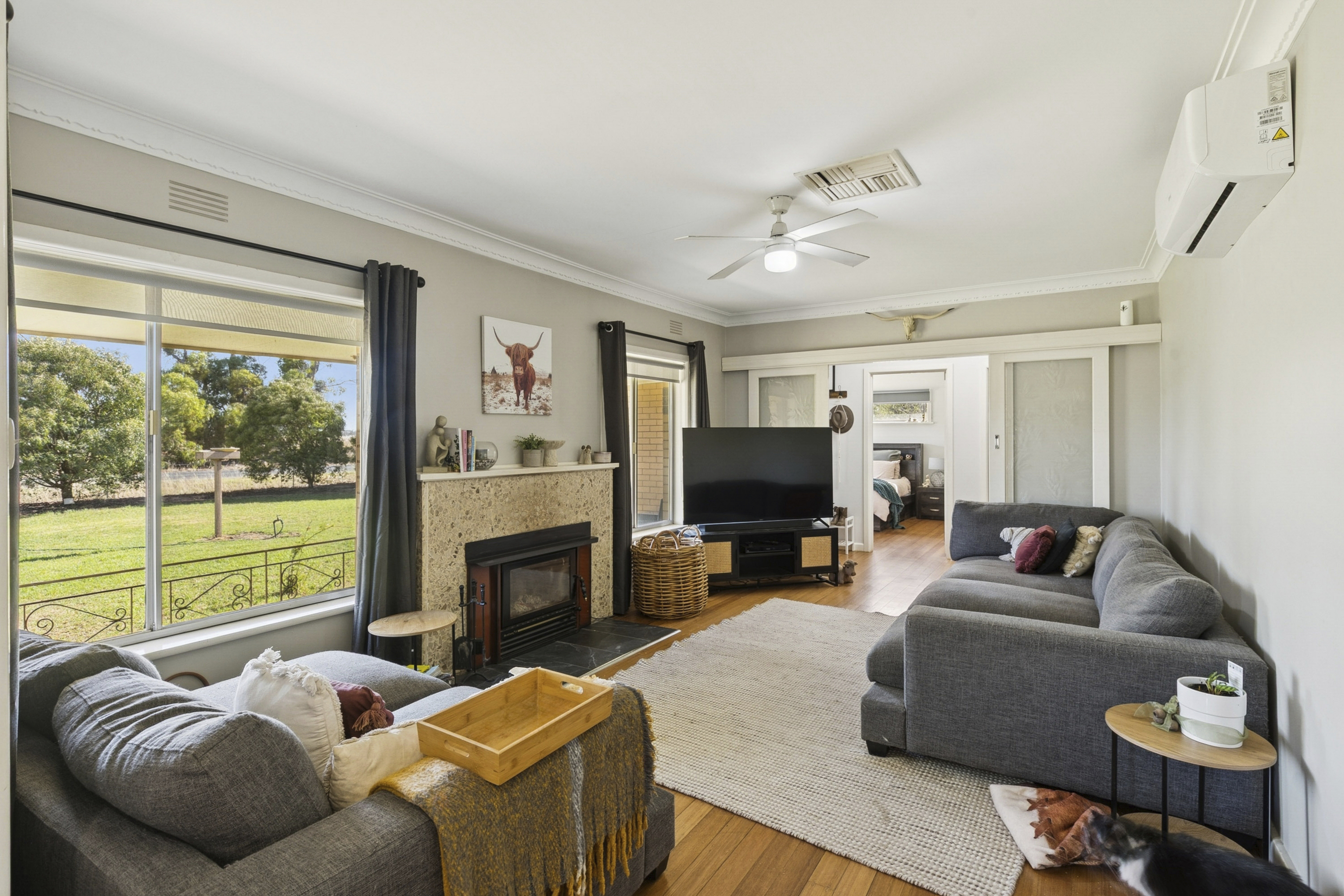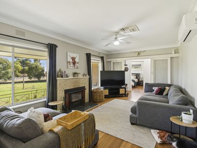 The home showcases a spacious, light-filled kitchen flowing seamlessly into multiple living zones, offering flexibility for families and entertainers alike. Three generously proportioned bedrooms are complemented by ceiling fans throughout, with two featuring built-in robes. Year-round comfort is assured with a wood-fired heater and split-system climate control in the main living area.