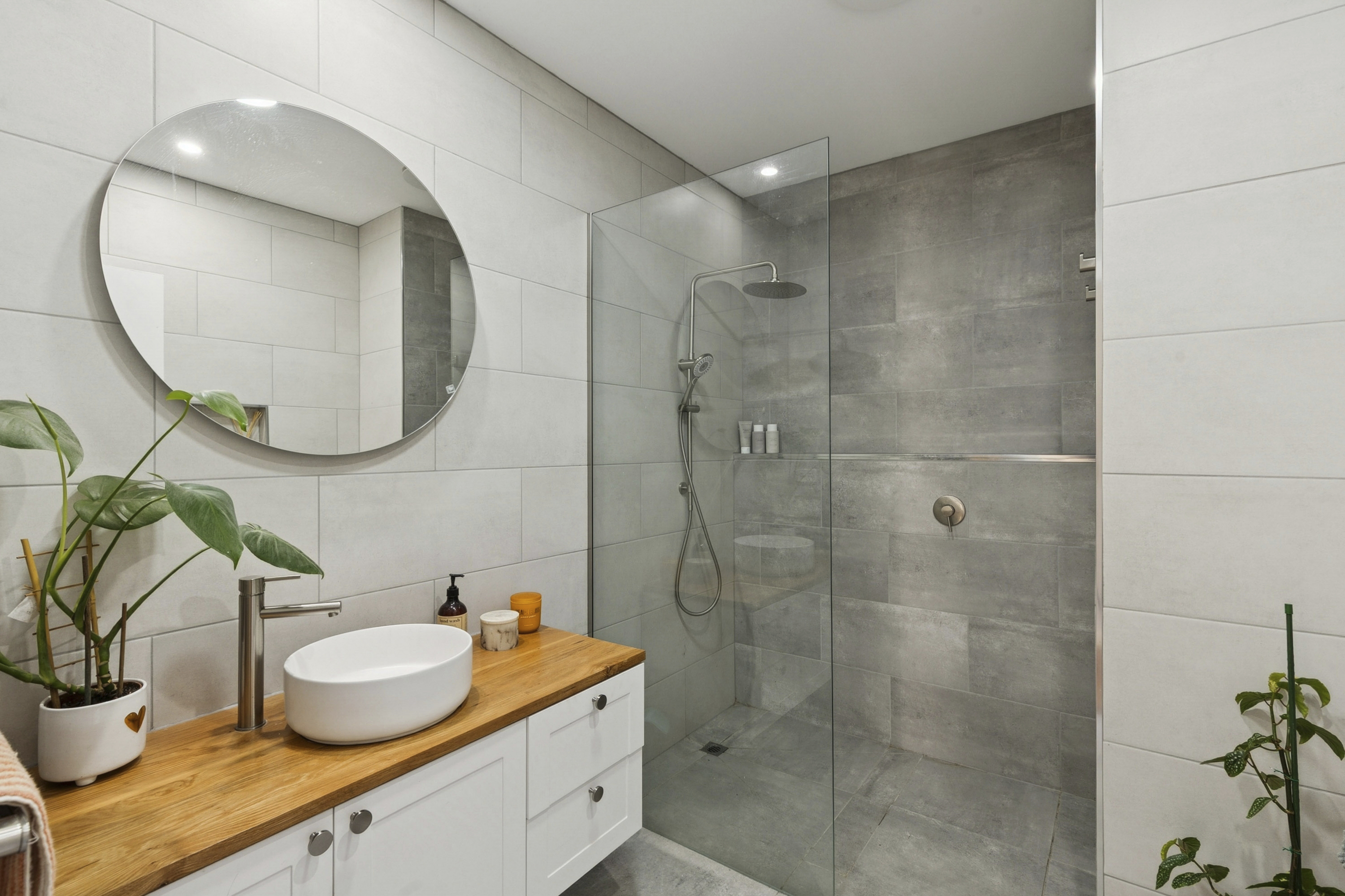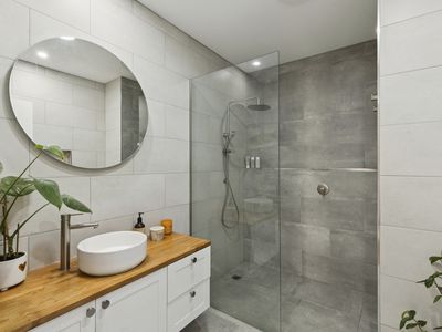 The central bathroom is beautifully appointed and features an expansive walk-in shower, creating a sense of understated luxury.