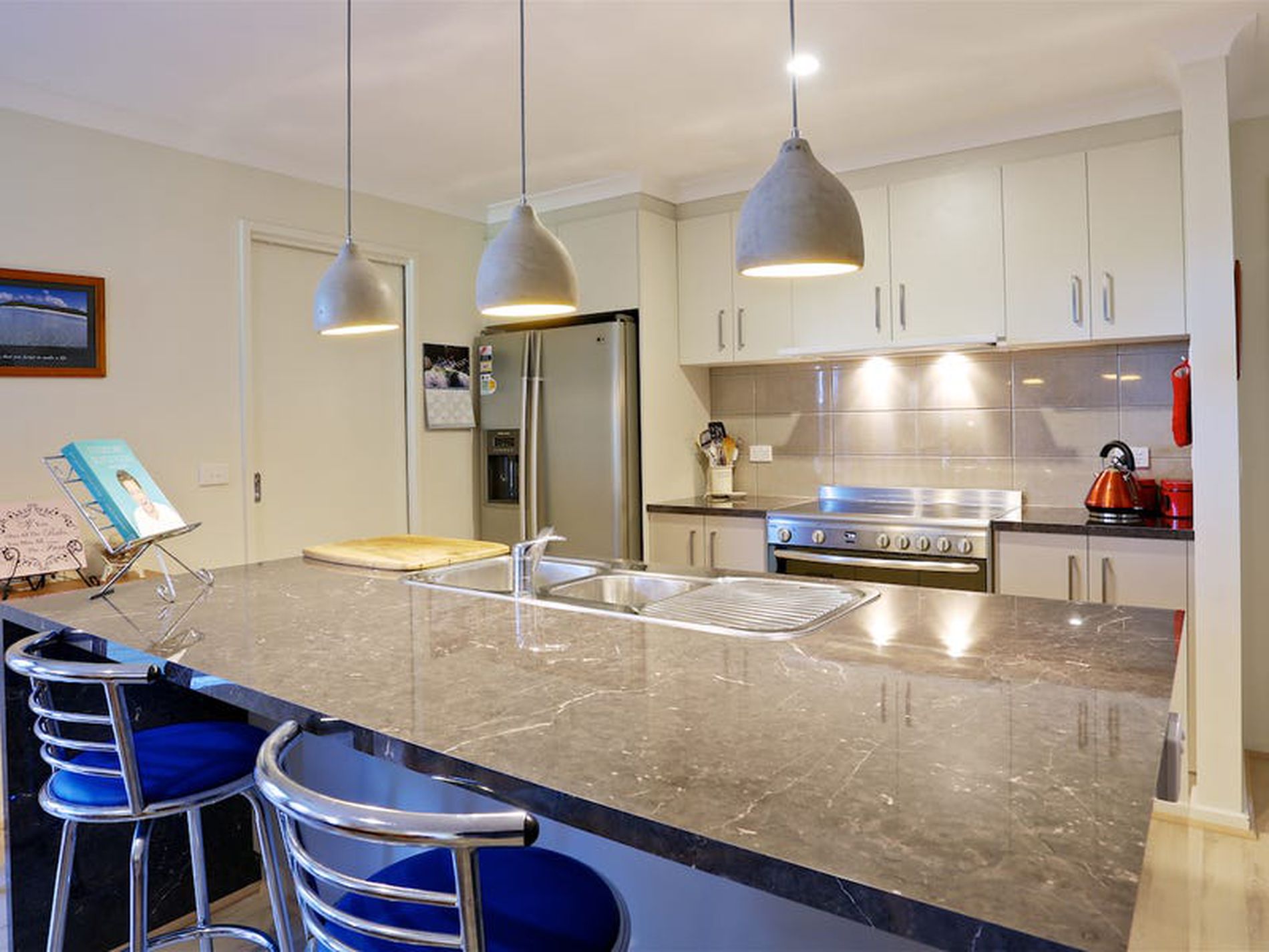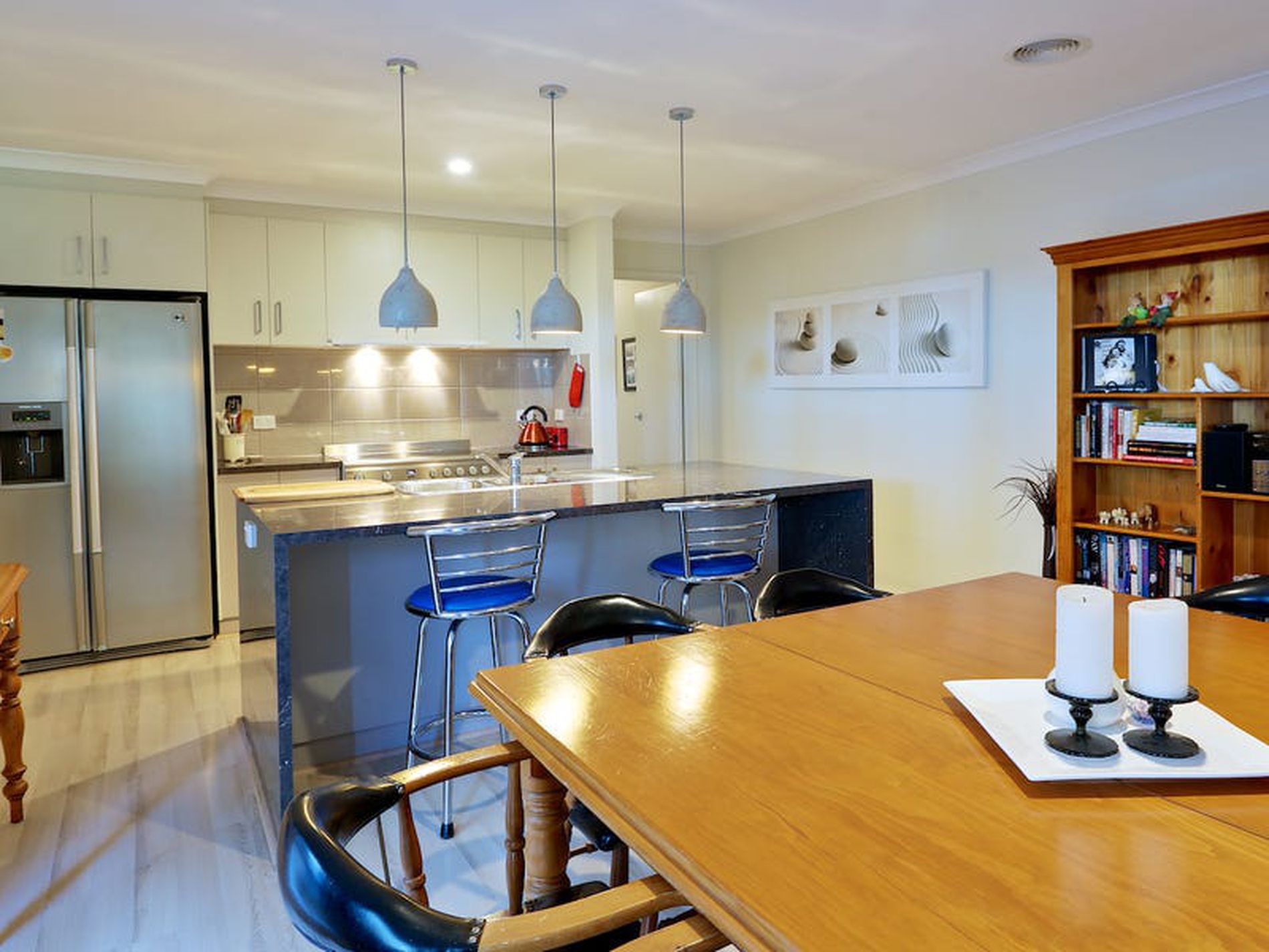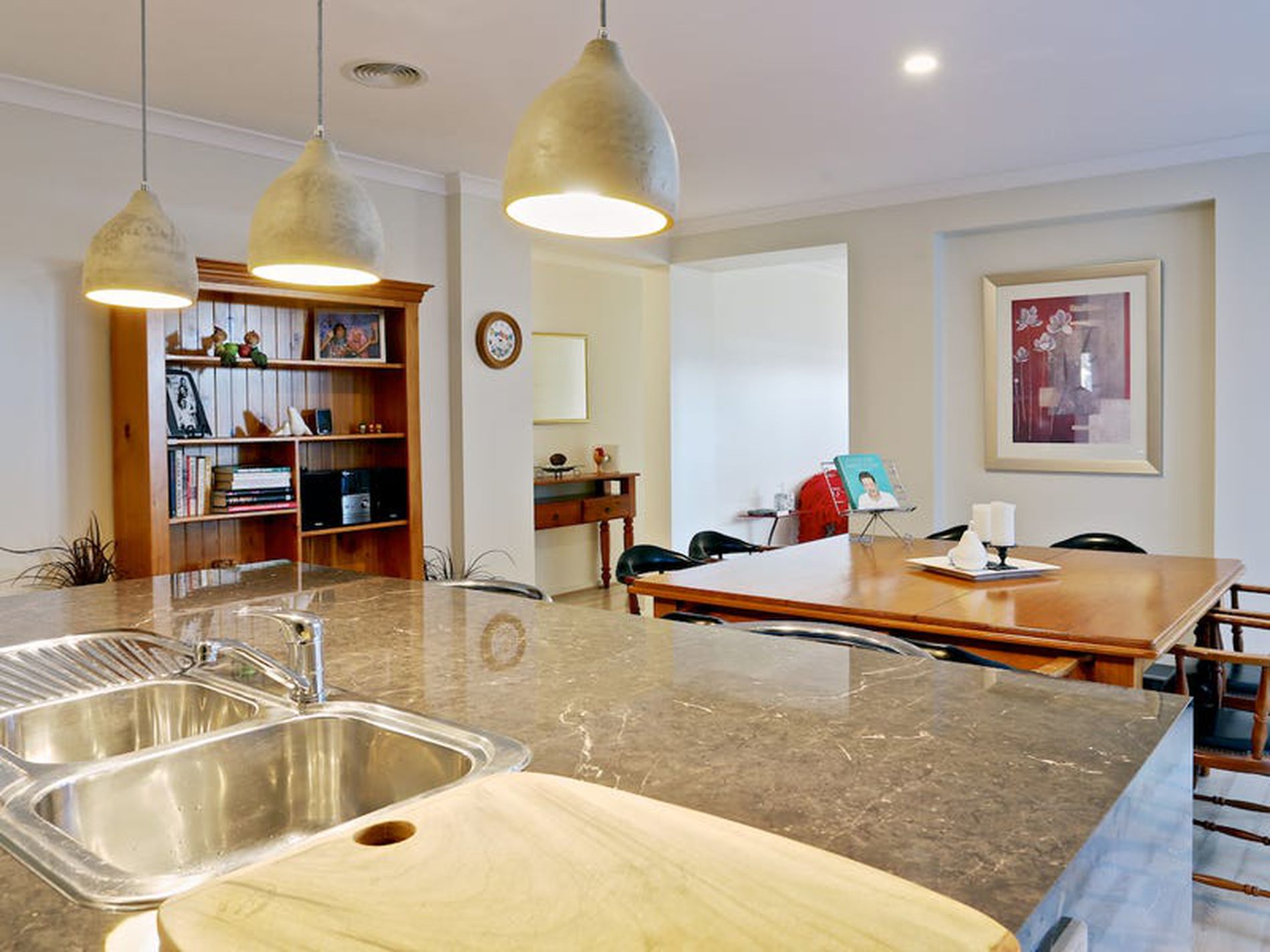 Open plan kitchen meals area, with features such as stone bench-tops and sliding draw dishwasher, this is a classy kitchen.
