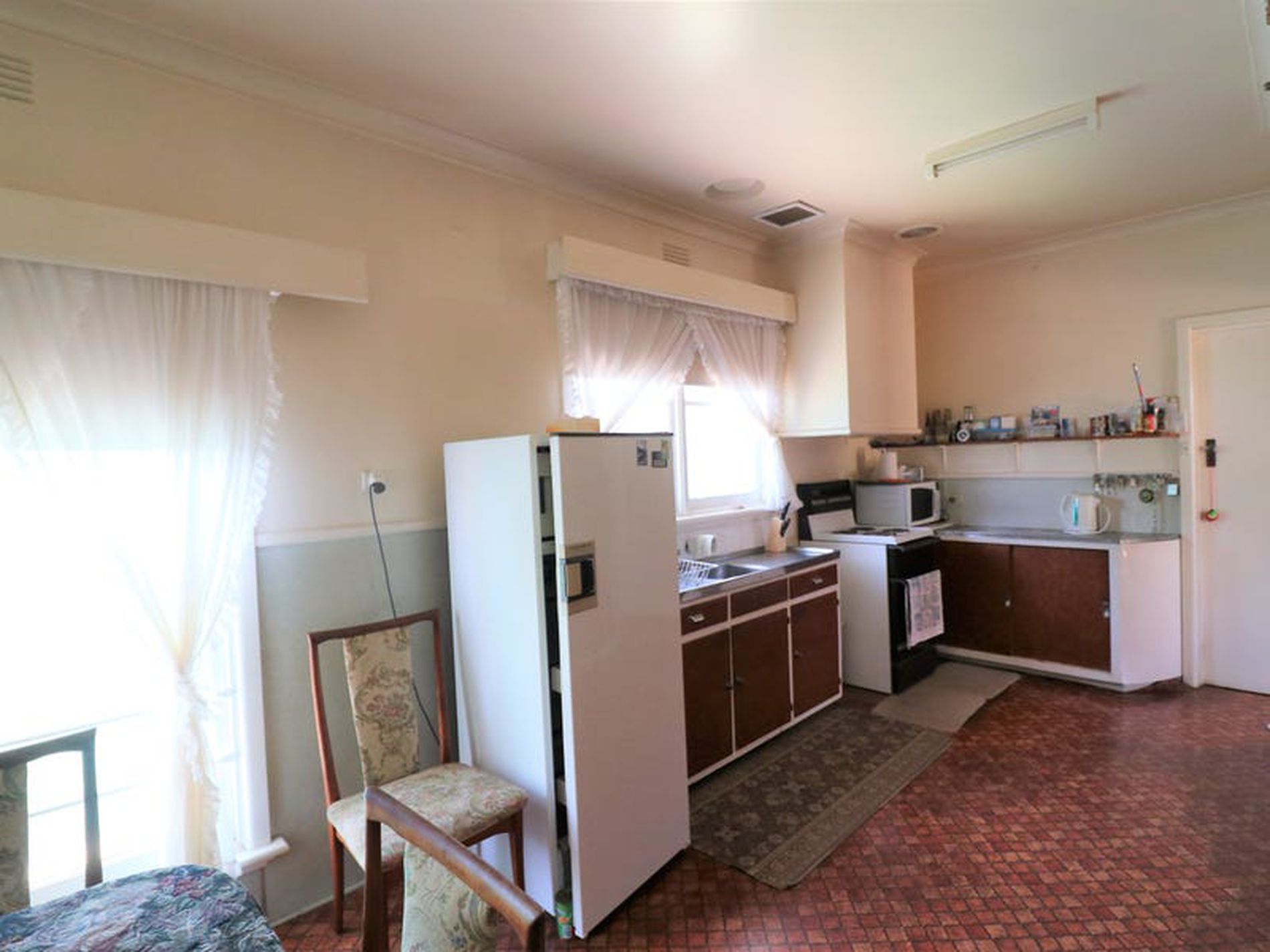 Open kitchen dining area, plenty of storage!! Spacious living area, enjoying a cosy wood fire and split system.