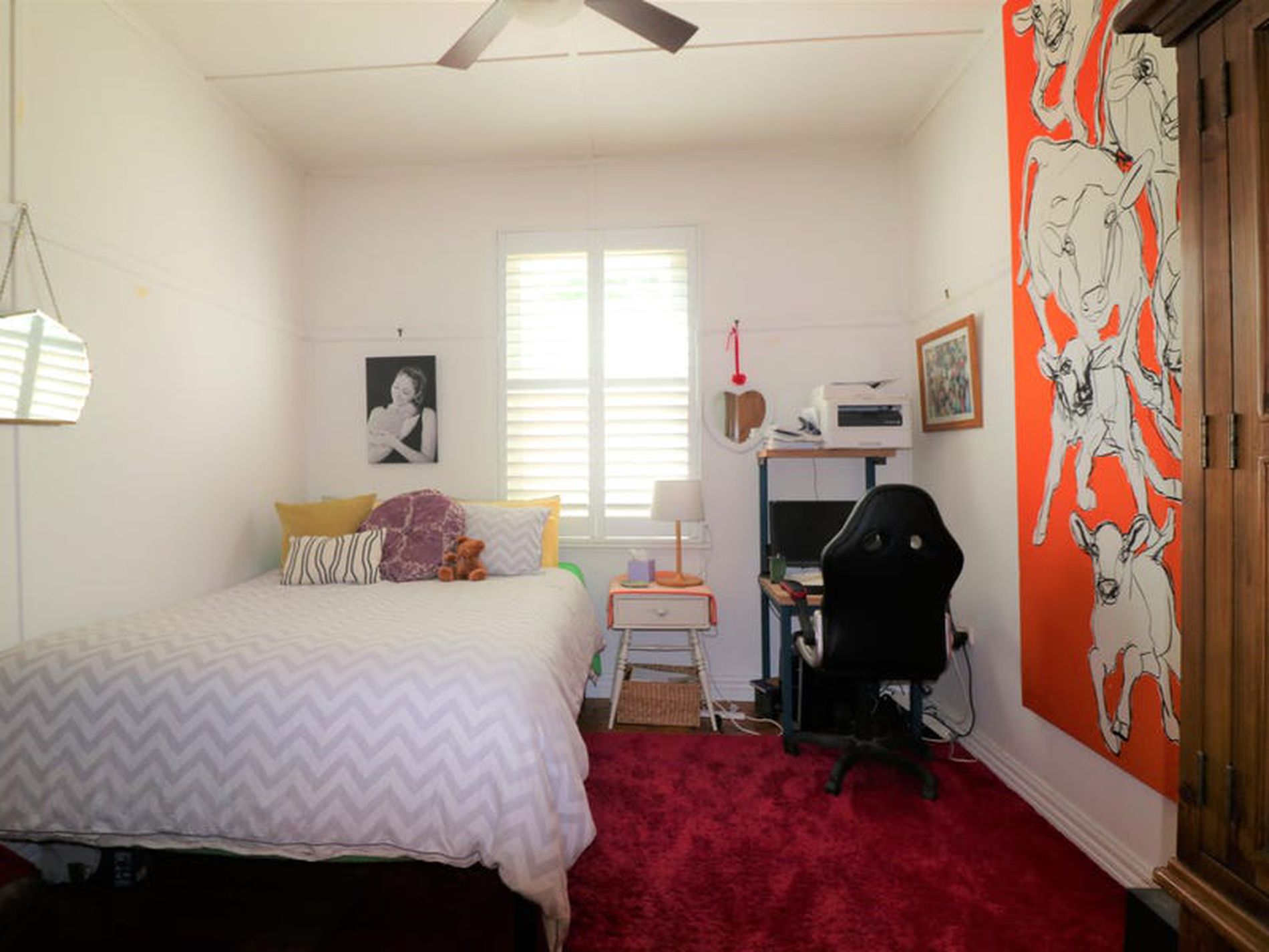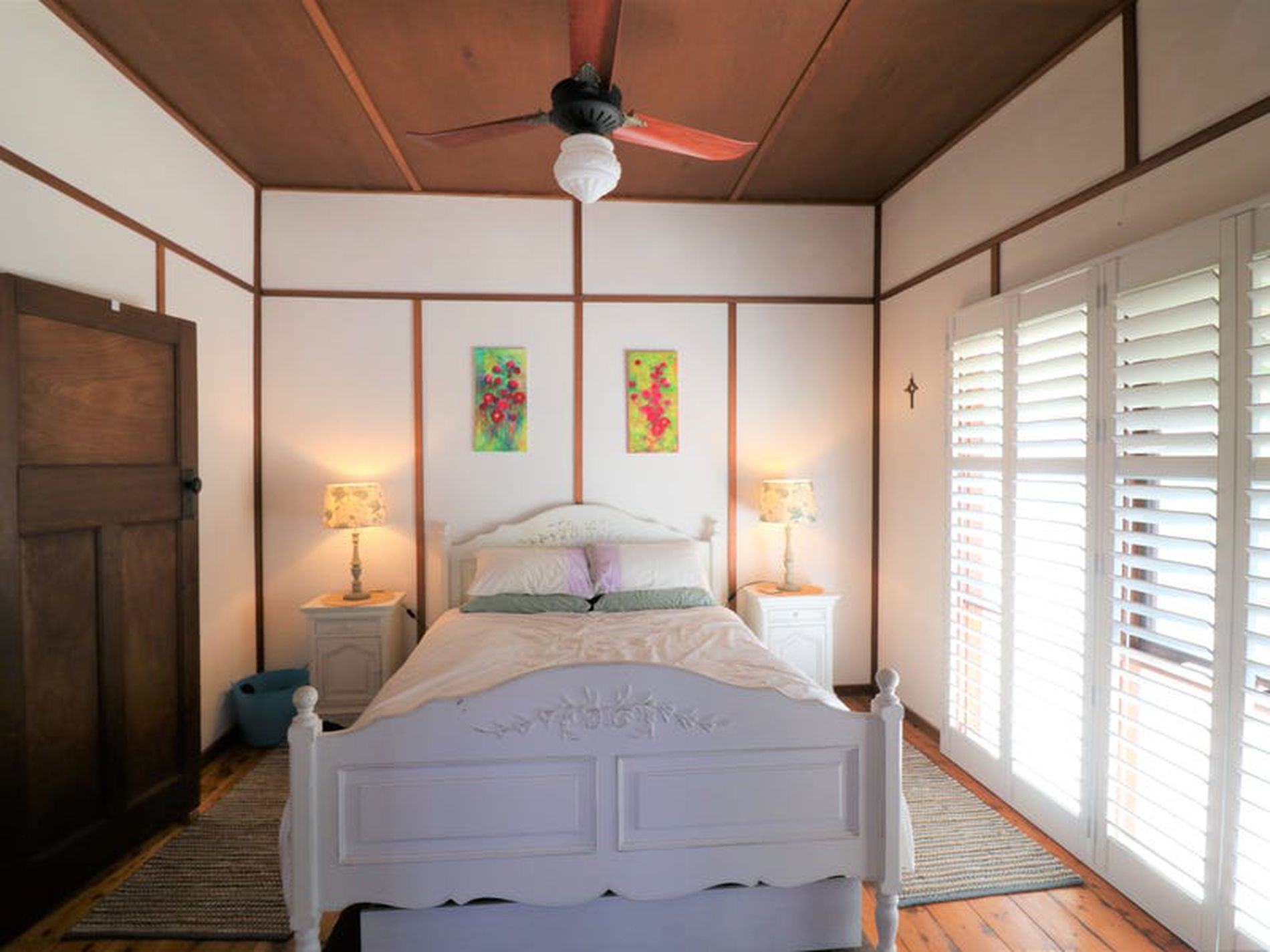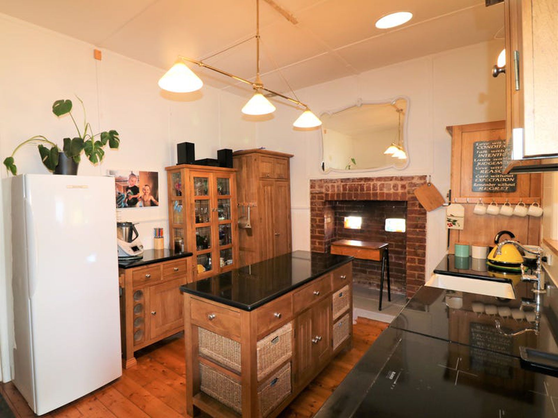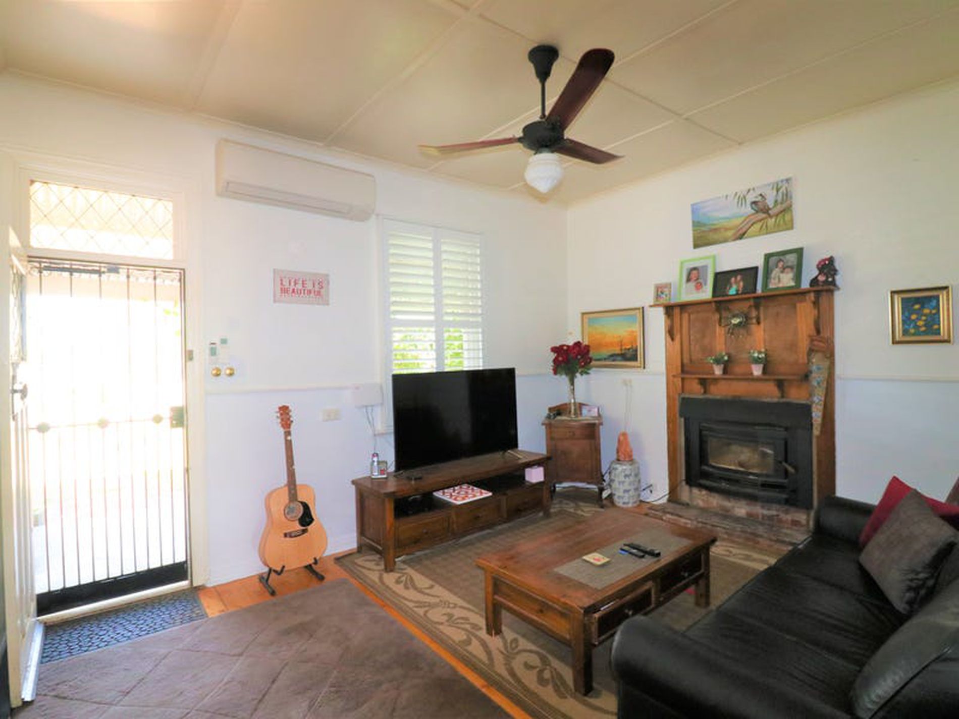 - Central living area with polished floor boards, fan, wood fire, reverse cycle split system
