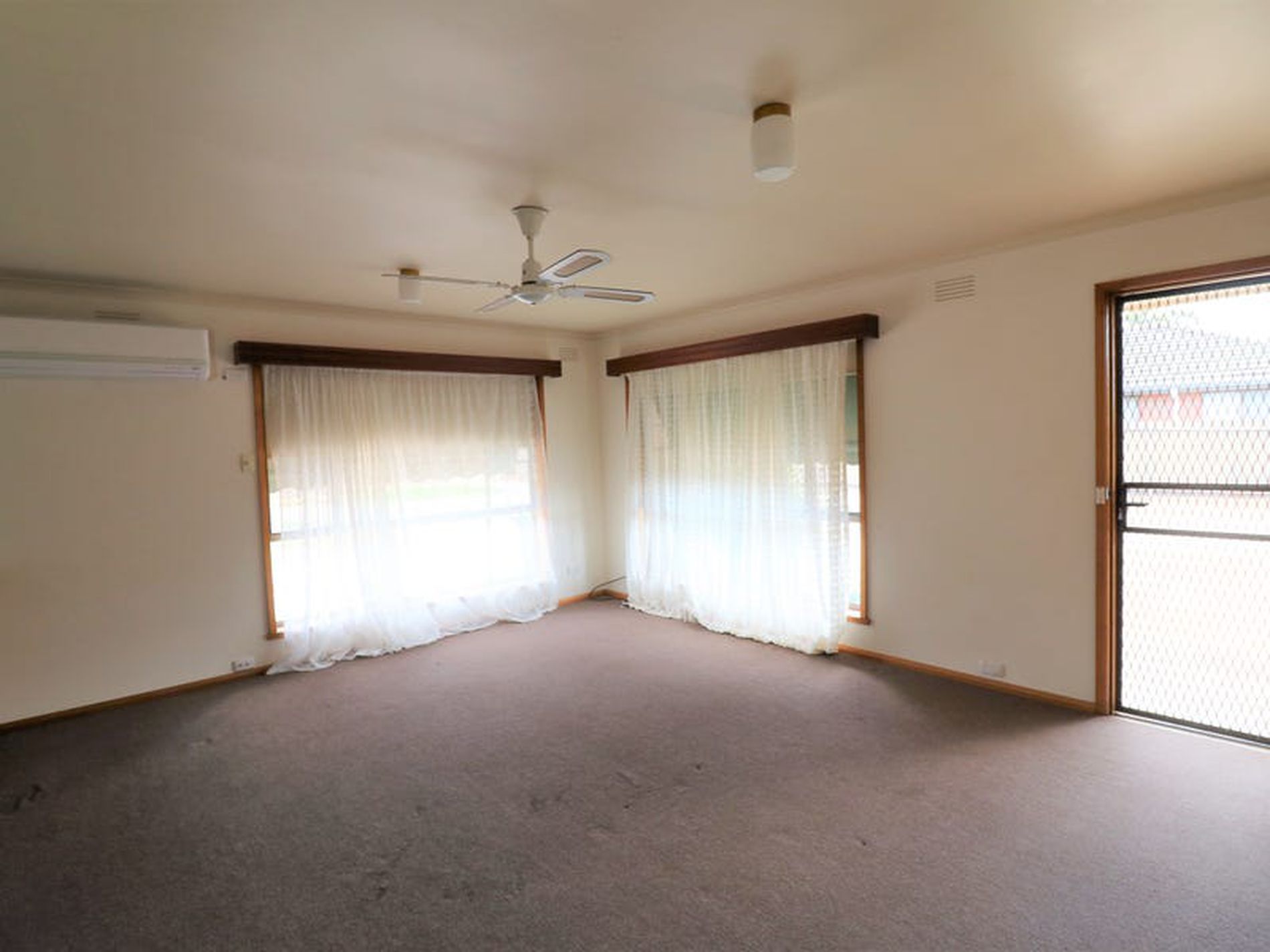 - Large central living area, with split system, fan, and light filled windows