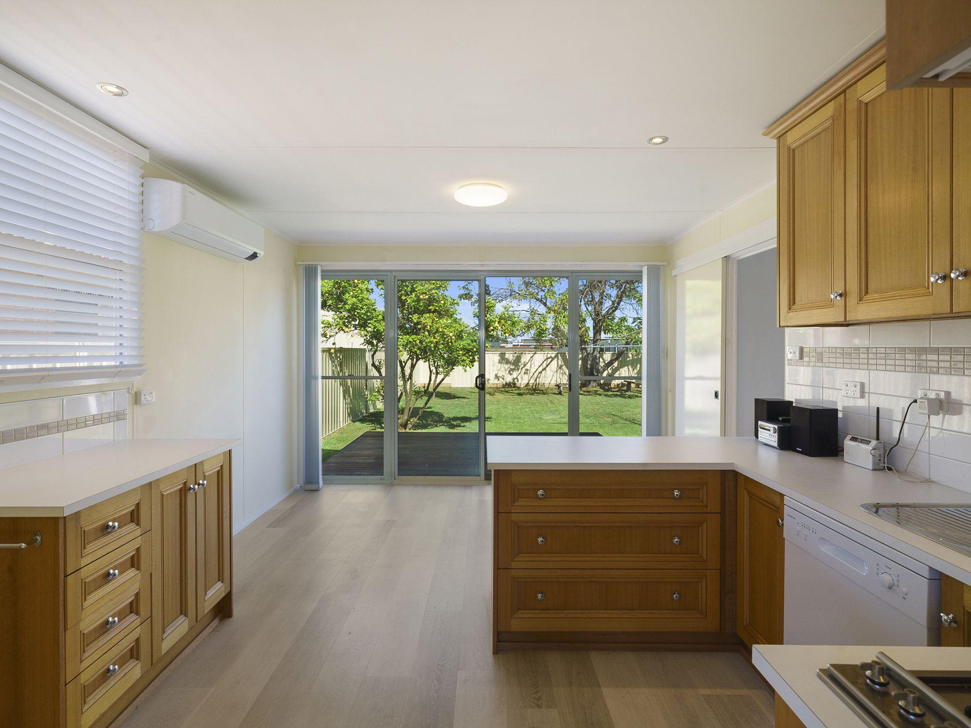 - As new timber kitchen with sliding doors to outdoor decked area.